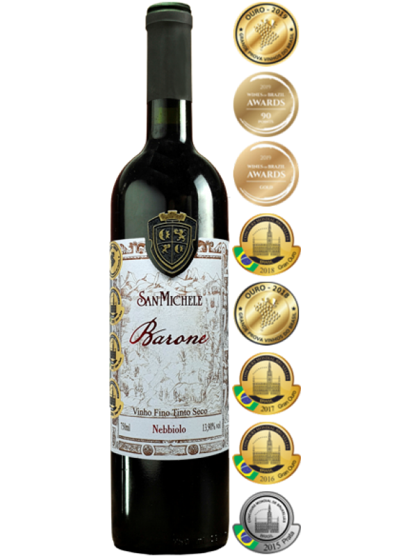 Vinho San Michele - Barone - Tinto Seco - Nebbiolo, coloração vermelho-rubi pouco intenso com reflexos violáceos Nos aromas, lembra nuances de rosa, violeta, framboesa, cereja, baunilha, noz-moscada, chocolate e tabaco. Em boca, é robusto, estruturado, elegante, harmônico e com taninos marcantes. Onde pede harmonização de comidas encorpadas e ricas, como ensopados de carnes (vitela, porco, javali, cordeiro, aves exóticas), massas com molhos cremosos, queijos fortes e maduros.